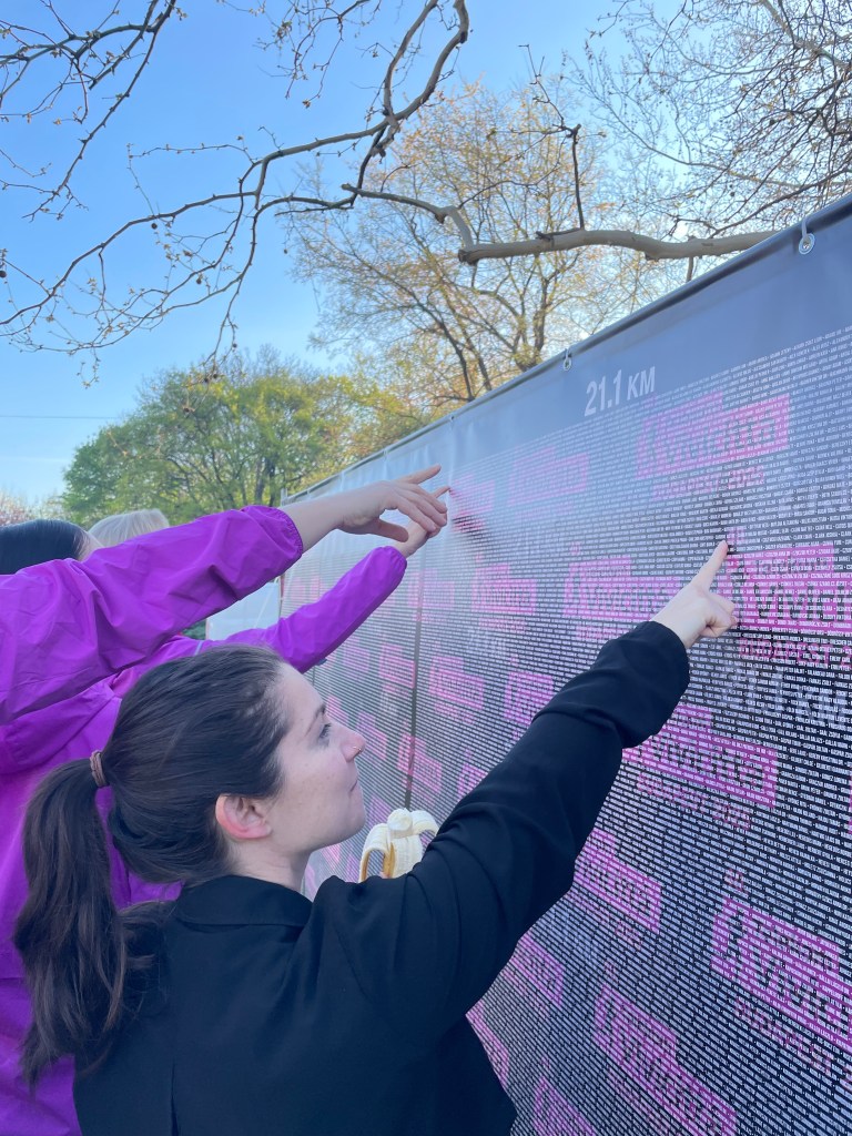 On race day, my warm-up was a leisurely two-mile walk to Margaret Island. Once I arrived, I headed straight to the water tower to pick up my race number and shirt. All I needed was the bib number from my confirmation email, and the process was quick and easy. I was genuinely impressed by how well-organized everything was—and by how many amenities were available for runners. The event area felt like a small village, complete with tents, vendors, and a festive atmosphere. Large signs displayed clear directions and the course map, and one especially fun touch was a massive board listing all the participants’ names—it was a great moment trying to spot mine among thousands of others.